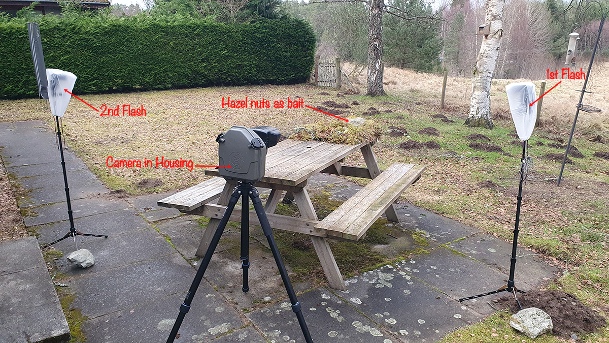 To make the photos nicer than just the Pine Marten on a picnic table I got a few rocks and moss and made a suitable looking scene at the end of the table which also gave some where to hide the hazel nuts as I didn't wont them in the photo. The camera housing was attached to a camera tripod and the PIR sensor was on a small tripod. I used two flashes on a couple of folding stands with a rock on each to stop any wind blowing them over. As you can see in the photo to keep the flashes dry I used a couple of drawstring plastic bags. I have since invested in some waterproof flash housings which you can see in the hedgehog setup photos below.