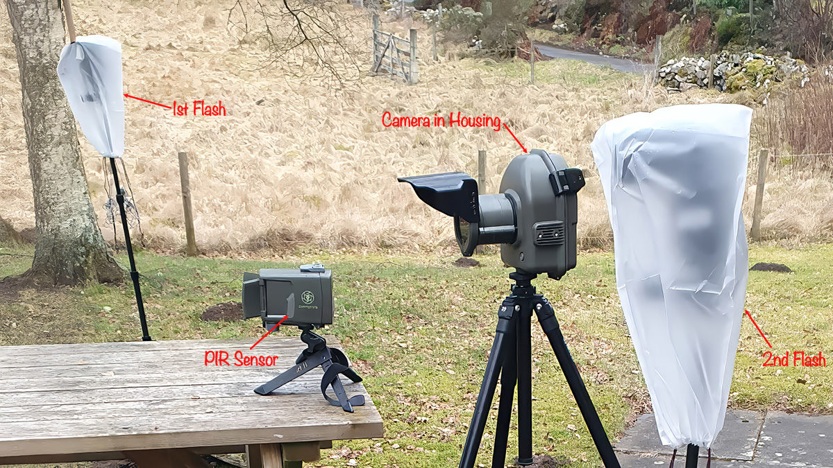 Once this is all set when the PIR Motion Sensor is triggered a wireless connection is made to the camera receiver which using the shutter release cable triggers the camera shutter. As the camera shutter is triggered the transmitter connected to the cameras hot-shoe mount sends a wireless signal to fire the flashes.