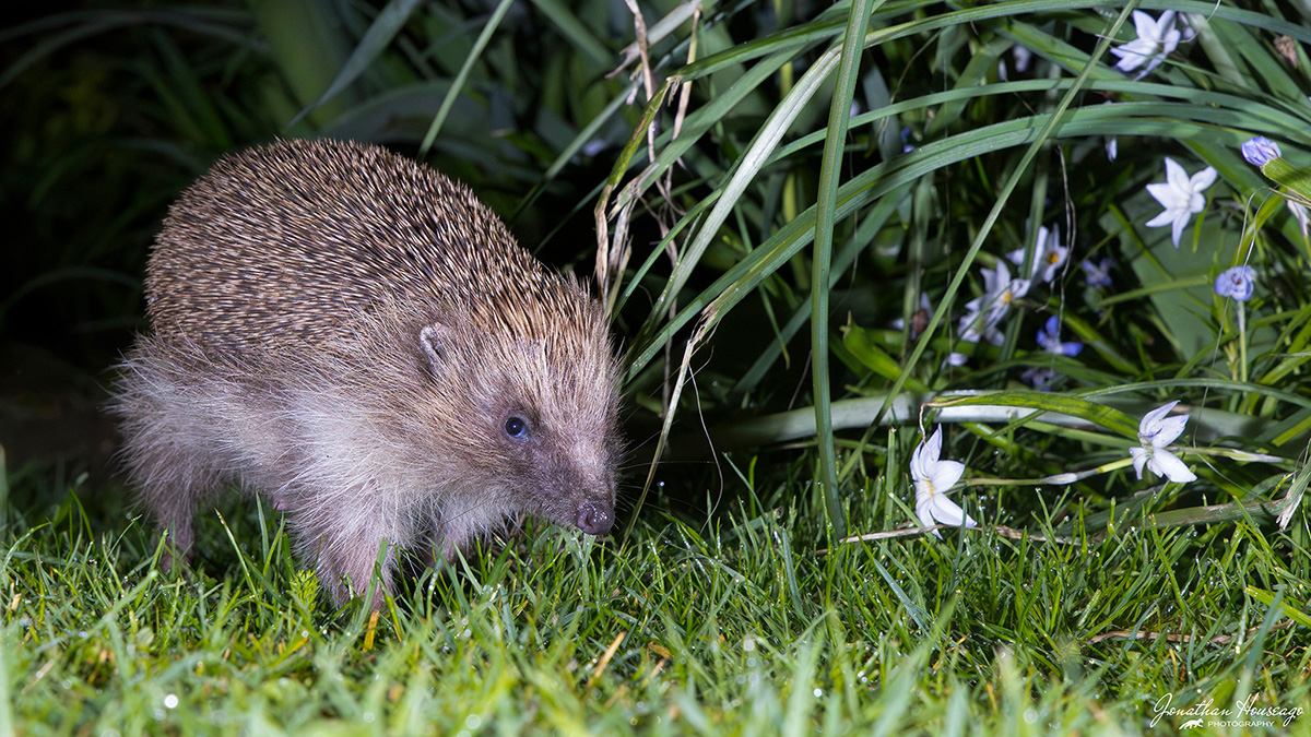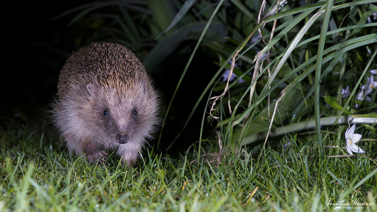 In the picture below you can see the setup that I used to capture these two images. The first thing I had to work out was where I would expect your subject to come from. This is all about knowing your field craft. In this case I knew that there was a Hedgehog sleeping in a nest box at the end of the path and that it would usually be coming towards the camera early in the evening when it woke up from its daytime slumbers. You also have to consider the composition of the photo and what will be in the background. In this case I wanted to get the hedgehog against some flowers. As you can see the PIR sensor was pointing in the direction of where the hedgehog was expected to come from and the flaps on the sensor were deployed to create a narrow sensor area. I used two flashes set at angle of @90º to each other. Both flashes had their diffuser on to try a create a more diffused light.